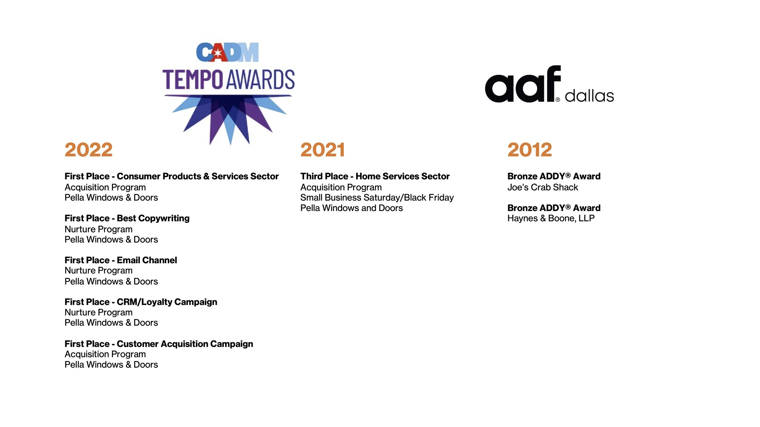 direct response, web copy, targeted versioning, email touches, white papers, blog content, paid and organic social, acquisition and lead gen